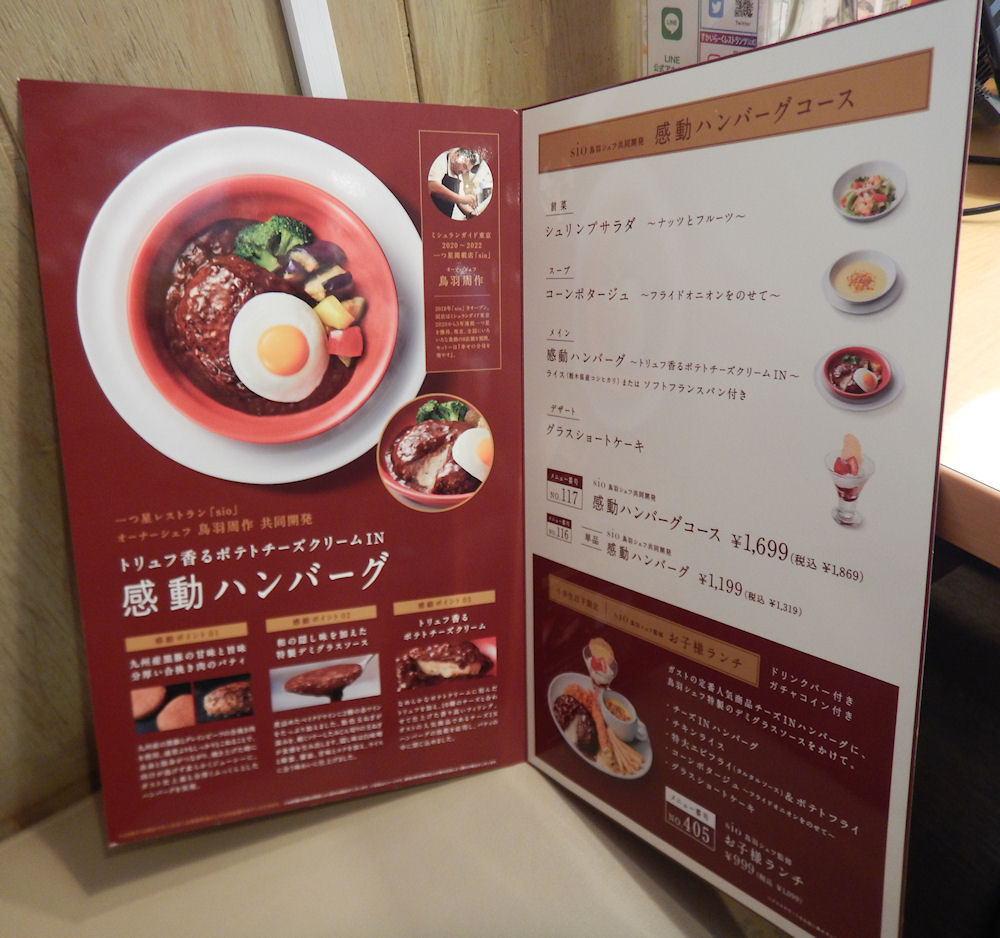 メニューを開くと、感動ハンバーグの、感動ポイントの説明や、コース料理の内容、お子様向けの「sio 鳥羽シェフ監修 お子様ランチ」も載っています。(写真をクリック(タップ)すると大きな写真で見れます) |
