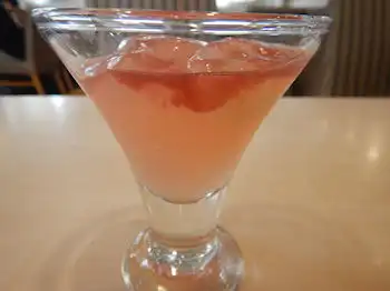 | ネコロボが持って来た時「フランボワーズソース」(ラズベリーソース)の酸っぱい香りがしてきた、ごろっと白桃のゼリー。 グラスの中に、たっぷり入った「白桃ゼリー」に、浮いているように見える「白桃」と、フランボワーズソース。 ![]() |