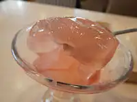 白桃ゼリー 相変わらず、スプーンで、すくおうとすると落ちそうになるガストのゼリー。とろ〜り、ぷるるん食感のゼリーは、フランボワーズソースの、ちょっぴり酸っぱさと甘さの後からの桃の甘さが美味しいです。 そして、グラスの底の方を食べると、さらに桃の甘さが強くなりました。 |